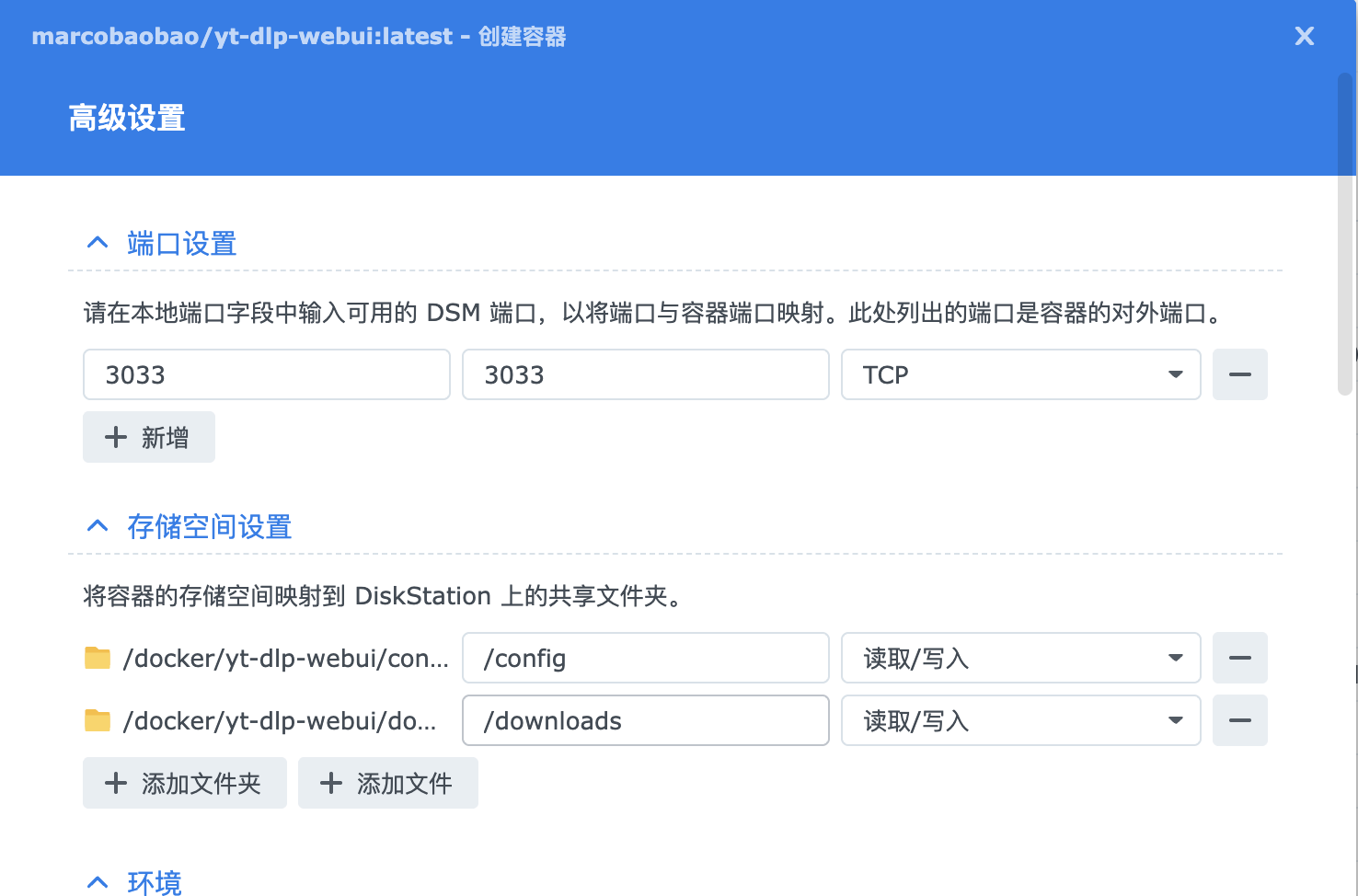 端口设置与卷映射,其他保持默认即可