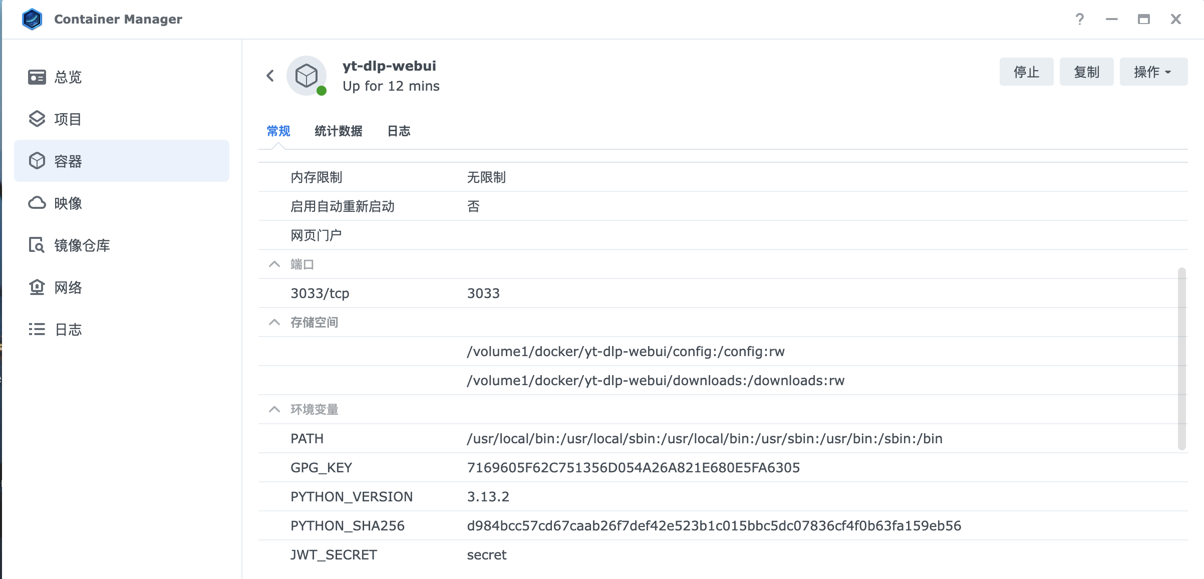 完成上述所有配置后,点击 “应用” 按钮保存设置,然后点击 “启动” 按钮来启动 yt-dlp-webui 容器,启动过程可能需要一些时间,请耐心等待,启动成功后在 Docker 的 “容器” 列表中可以看到 yt-dlp-webui 容器的状态为 “正在运行”。