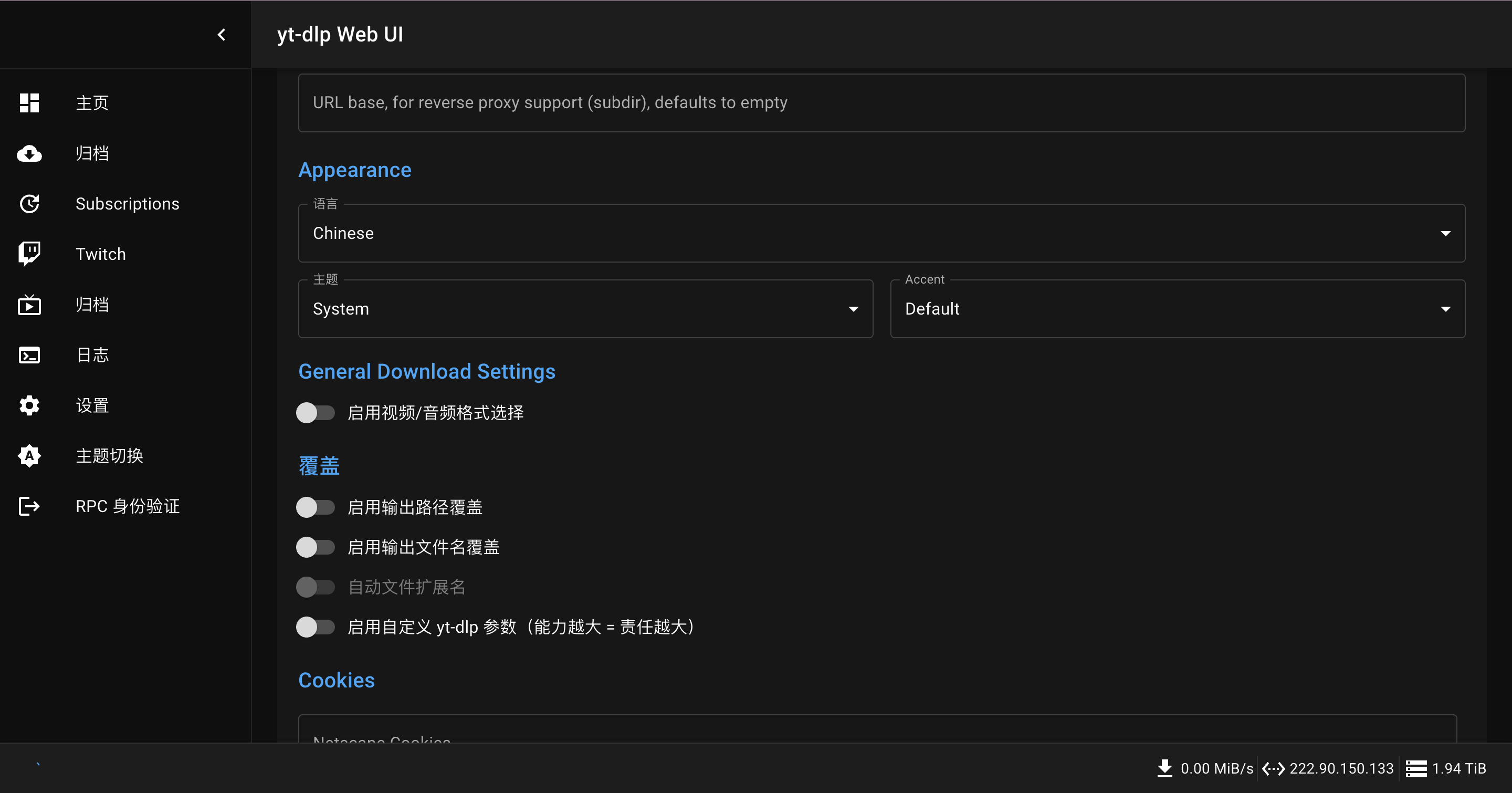 当 yt-dlp-web 容器成功启动后,我们就可以通过浏览器来访问它的 Web 界面。在浏览器的地址栏中,输入 http:// 群晖 IP:3033 即可访问,默认界面是英文,可以在这里切换为中文