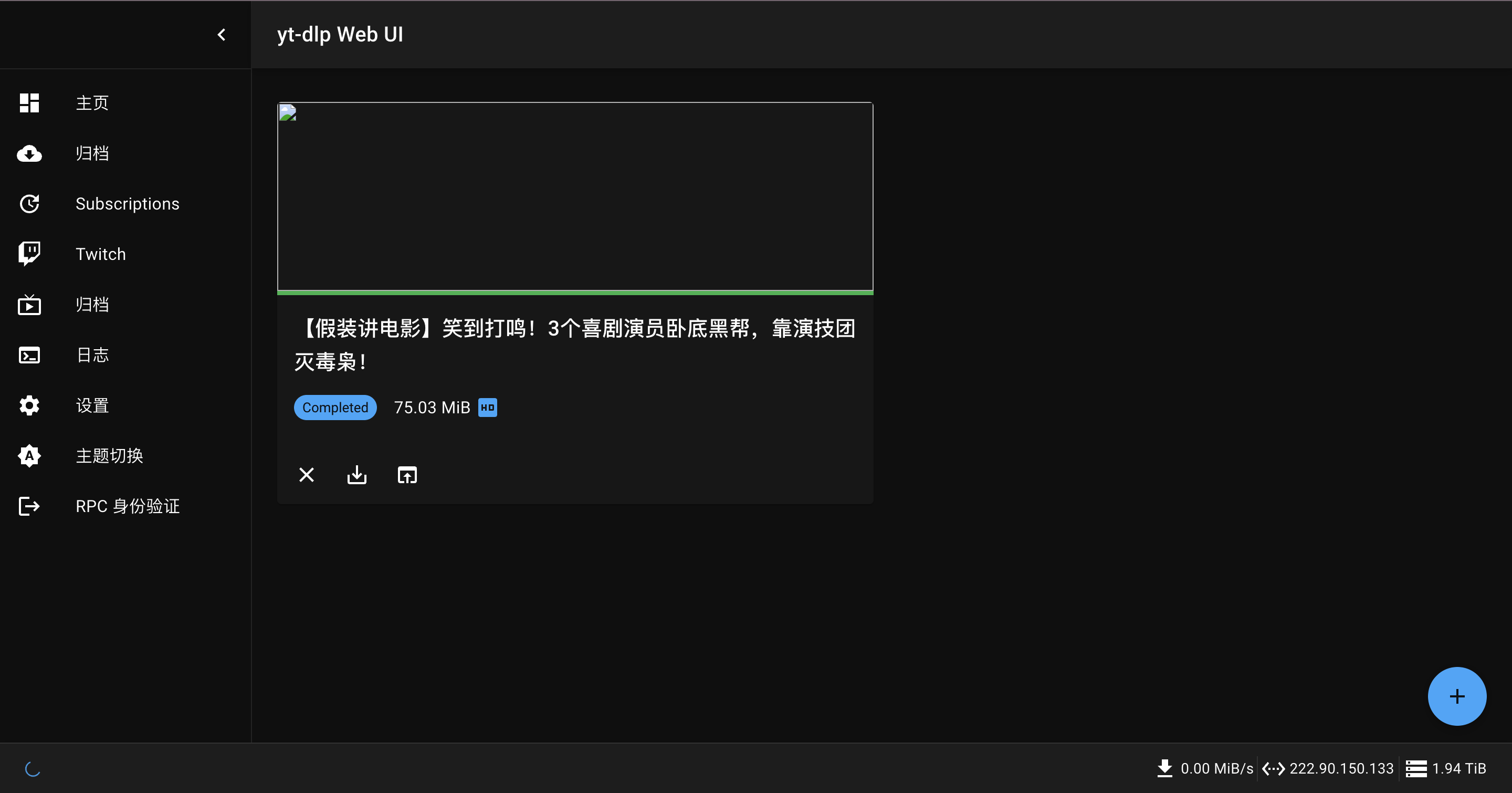 进入 yt-dlp-web 界面后,就能开始下载音视频了。以下载 B 站视频为例,打开 B 站,找到你想要下载的视频,复制浏览器地址栏中的视频链接。回到 yt-dlp-web 界面,将链接粘贴到 “URL” 输入框中 ,下方有一些下载参数可供选择,比如视频格式(如 MP4、FLV 等 )、分辨率、音频质量等 。你可以根据自己的需求进行选择,默认情况下,会下载最高质量的媒体文件。设置好参数后,点击 “下载” 按钮,任务就会添加到下载队列中。在下载过程中,可以在界面中监控下载进度、速度等信息。下载完成后,点击下载列表中的文件,可进行预览,还能对文件进行管理,如删除、下载到本地等操作。这里我随便找了一个在b站上的视频,不到1分钟就下载好了。