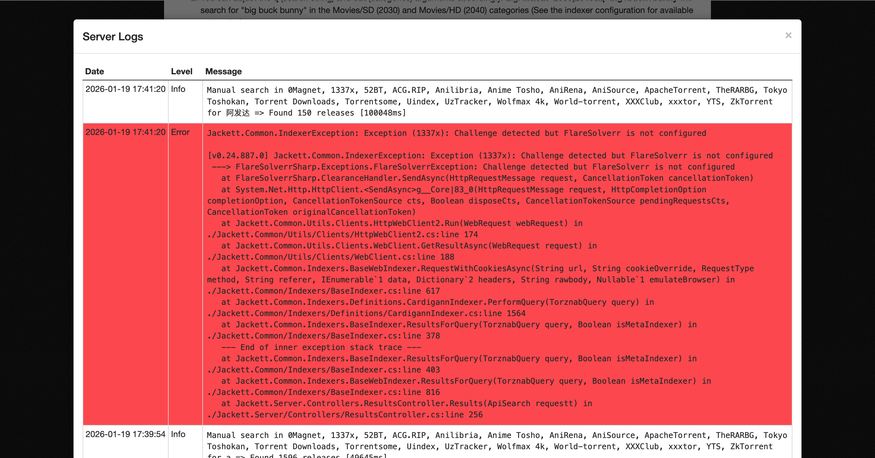 去Jackett中查看日志,发现报的这个错,FlareSolverr没有配置,所以需要安装配置FlareSolverr