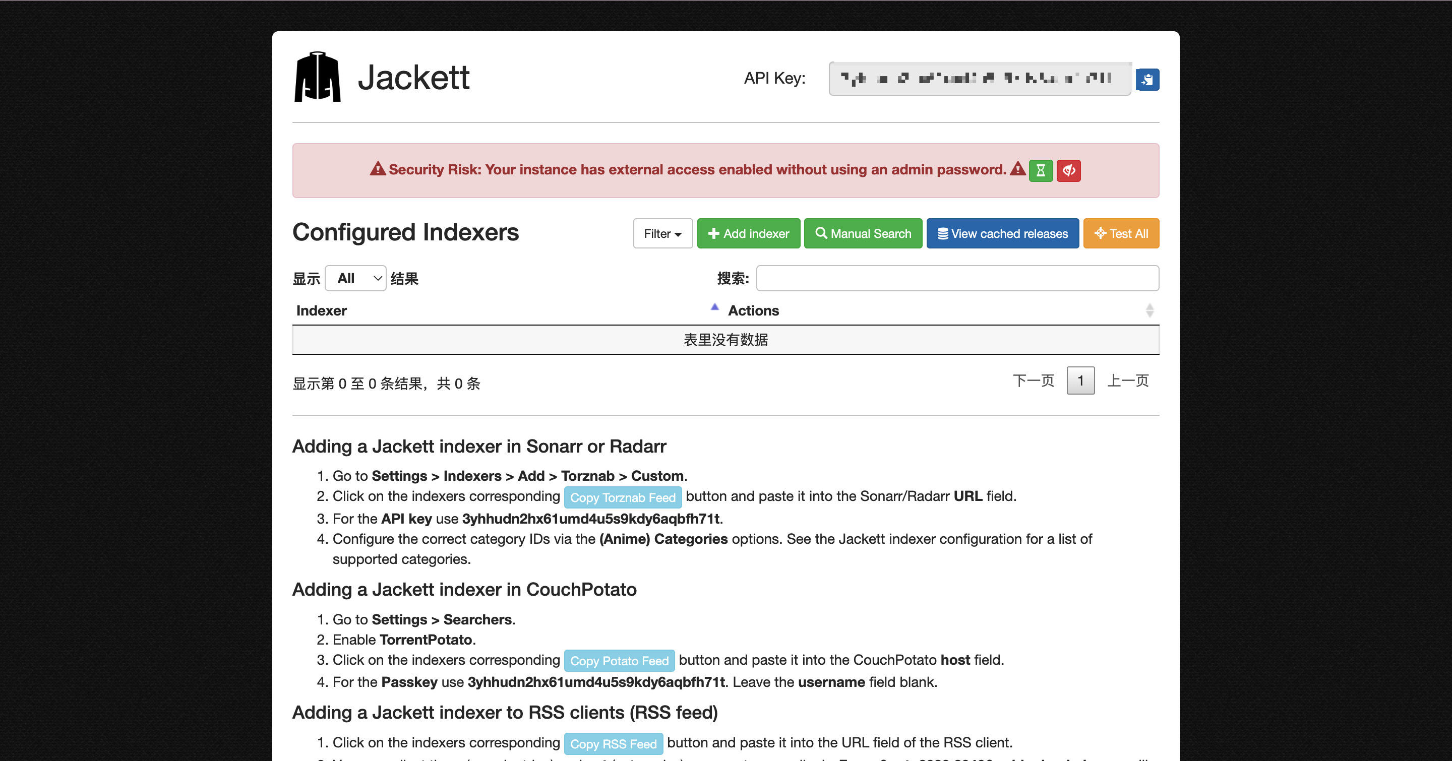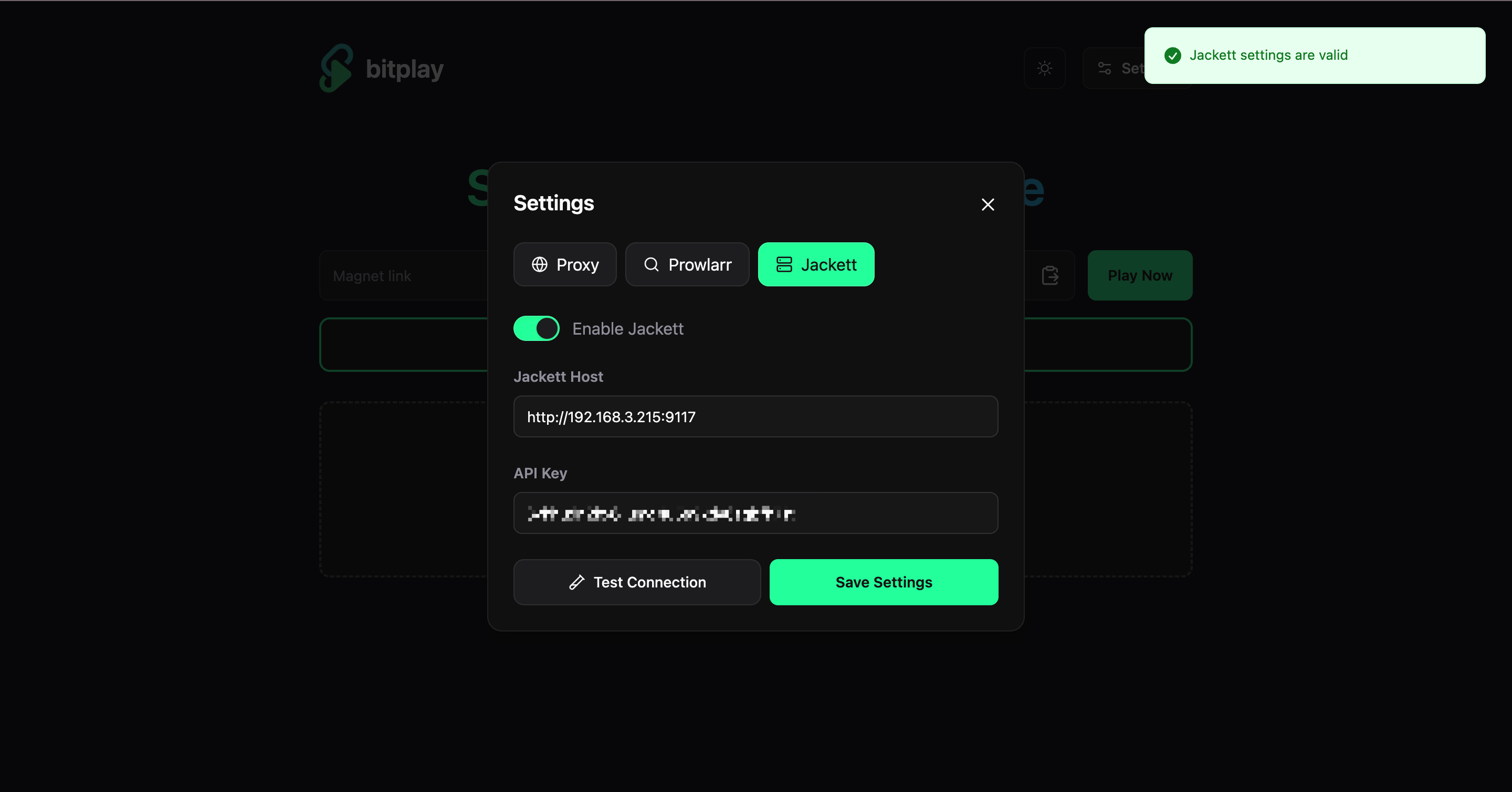 6、在bitPlay中添加配置,因为都是部署在nas上,这里host填内网地址即可,API Key就是打开Jackett的右上角那串字符串