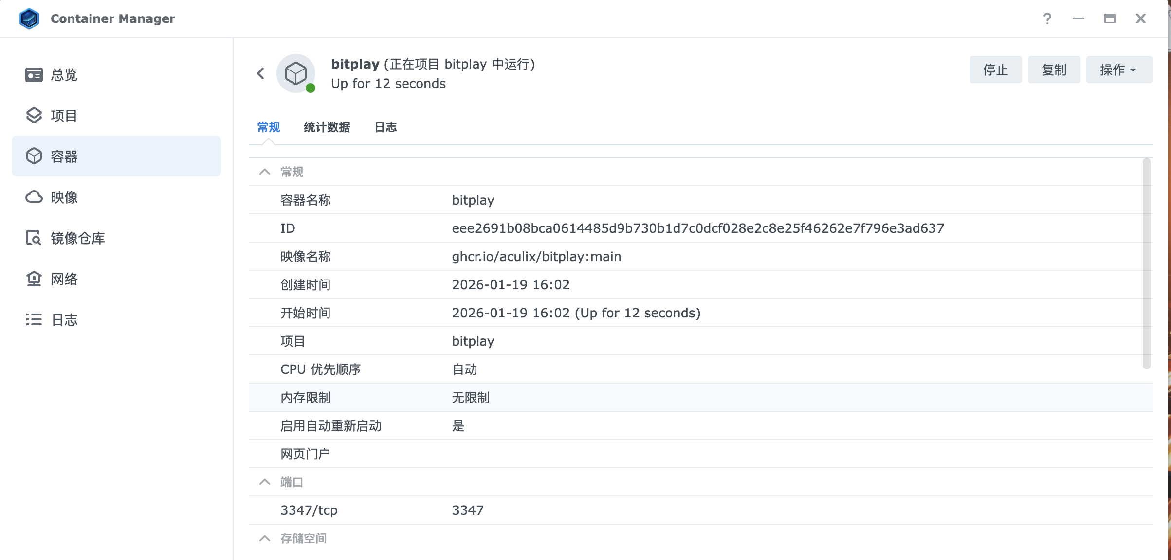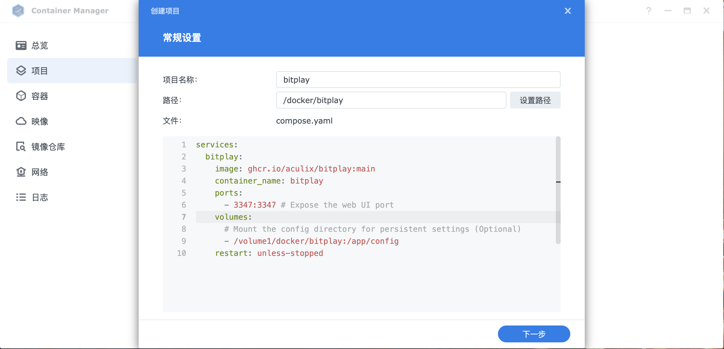 restart: unless-stopped2、创建的是就不是和之前一样创建容器里,而是创建项目,这个是群晖DSM7版本才有的,选择创建好的目录,会自动读取docker-compose.yaml 文件,一直点击下一步