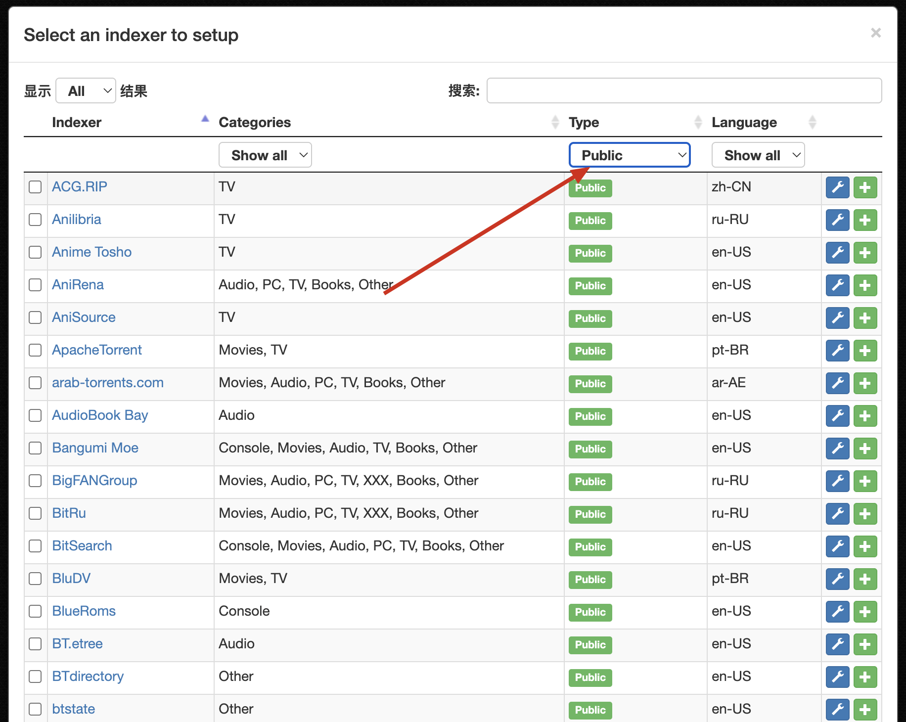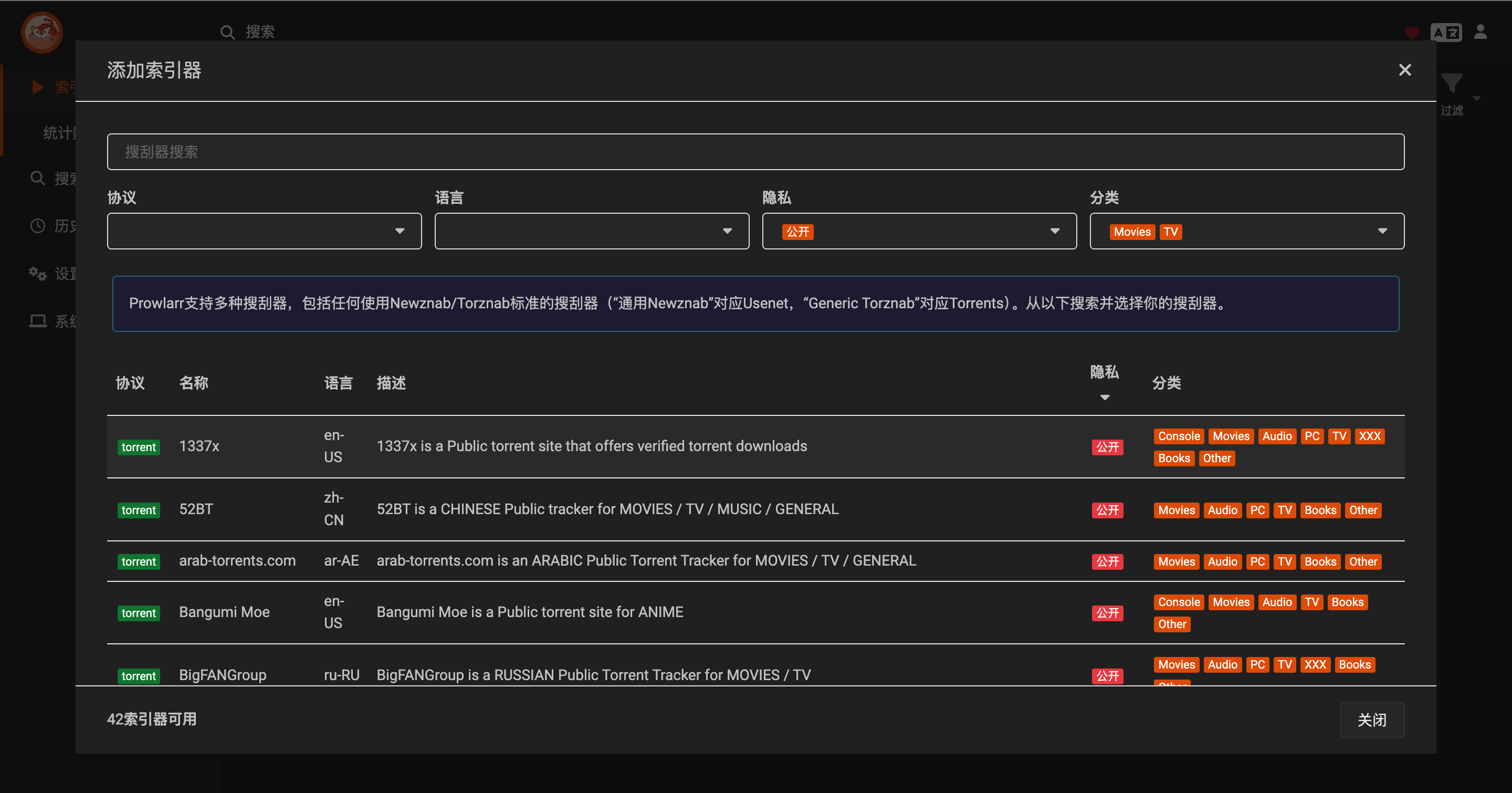 5、在Prowlarr中添加索引器,添加的时候可以先过滤一些公开的,再测试是否可用,可用再进行添加