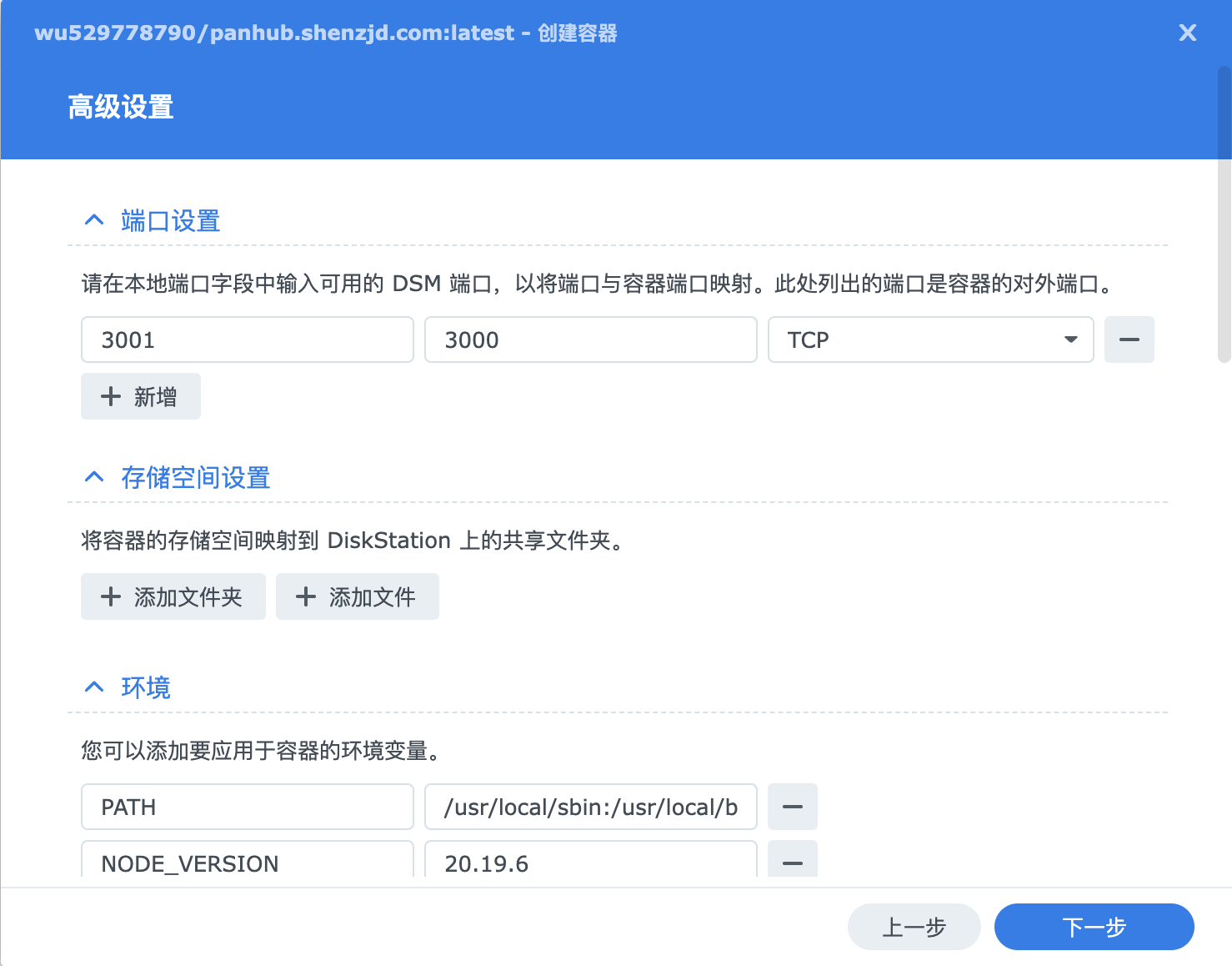 检查设置无误后,点击“下一步”并“完成”。待容器状态变绿显示“运行中”即可。