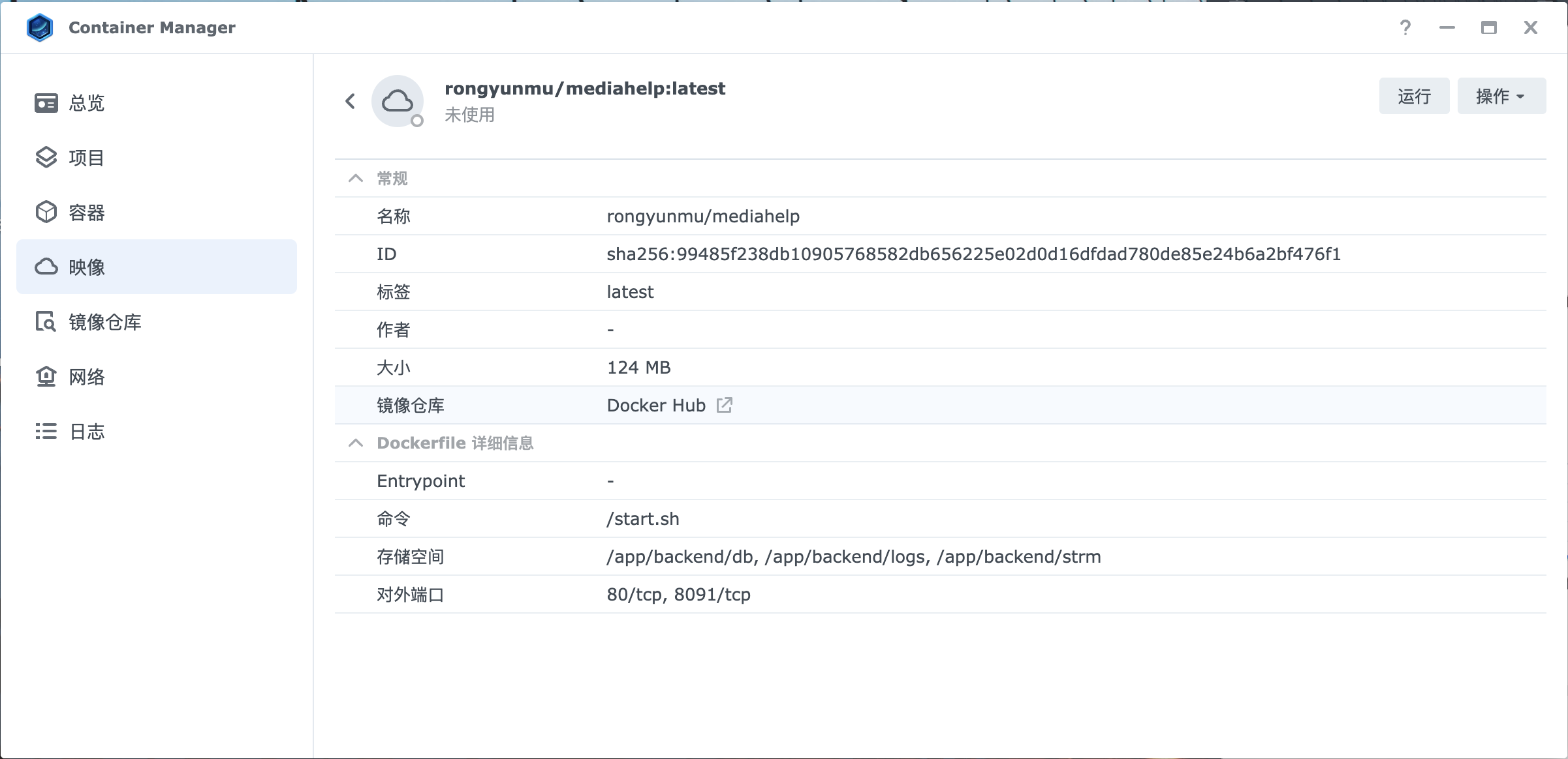 1. 镜像下载完成后,切换到 “映像” 页面,找到刚才下载的 “rongyunmu/mediahelp” 镜像,点击 “启动” 。