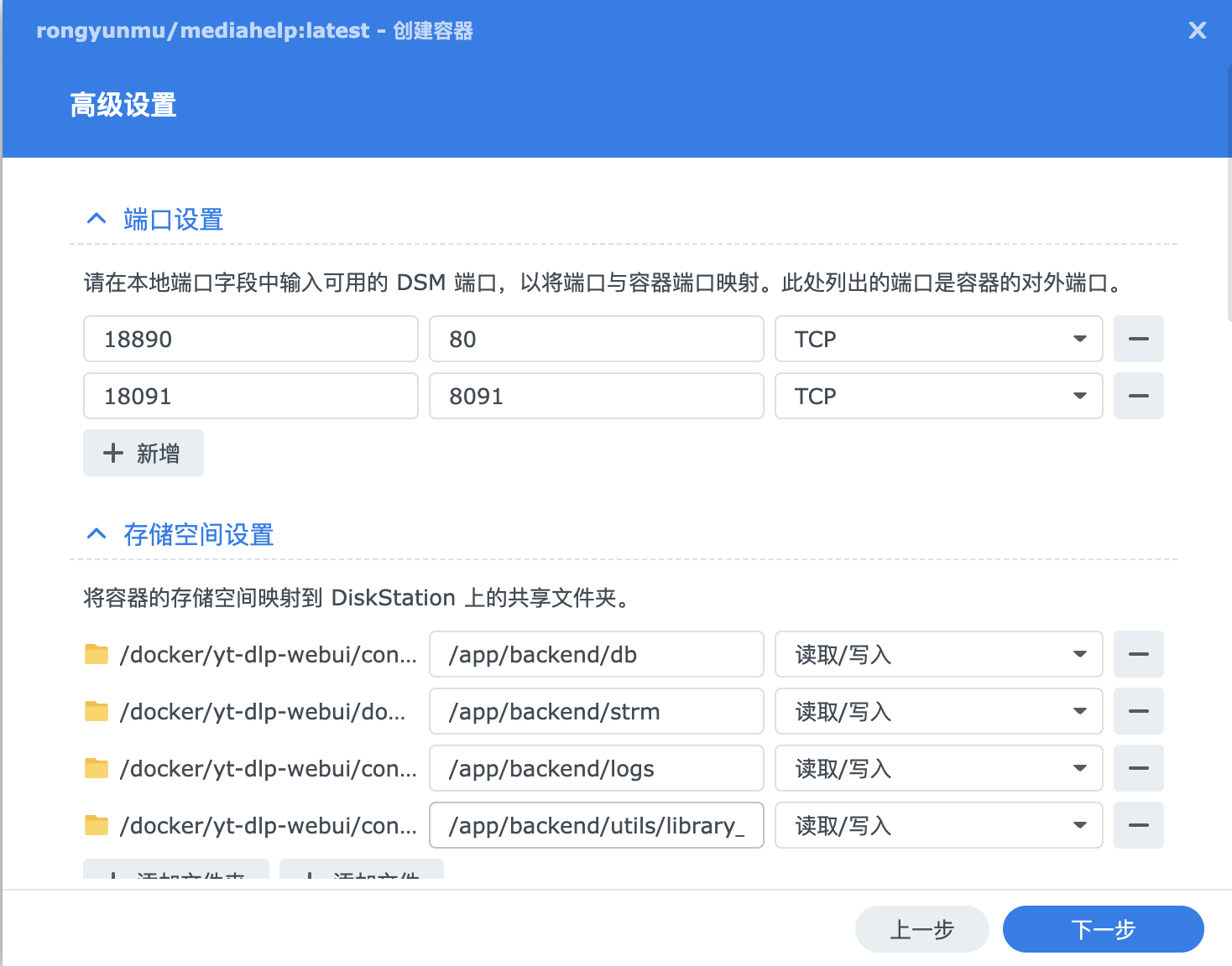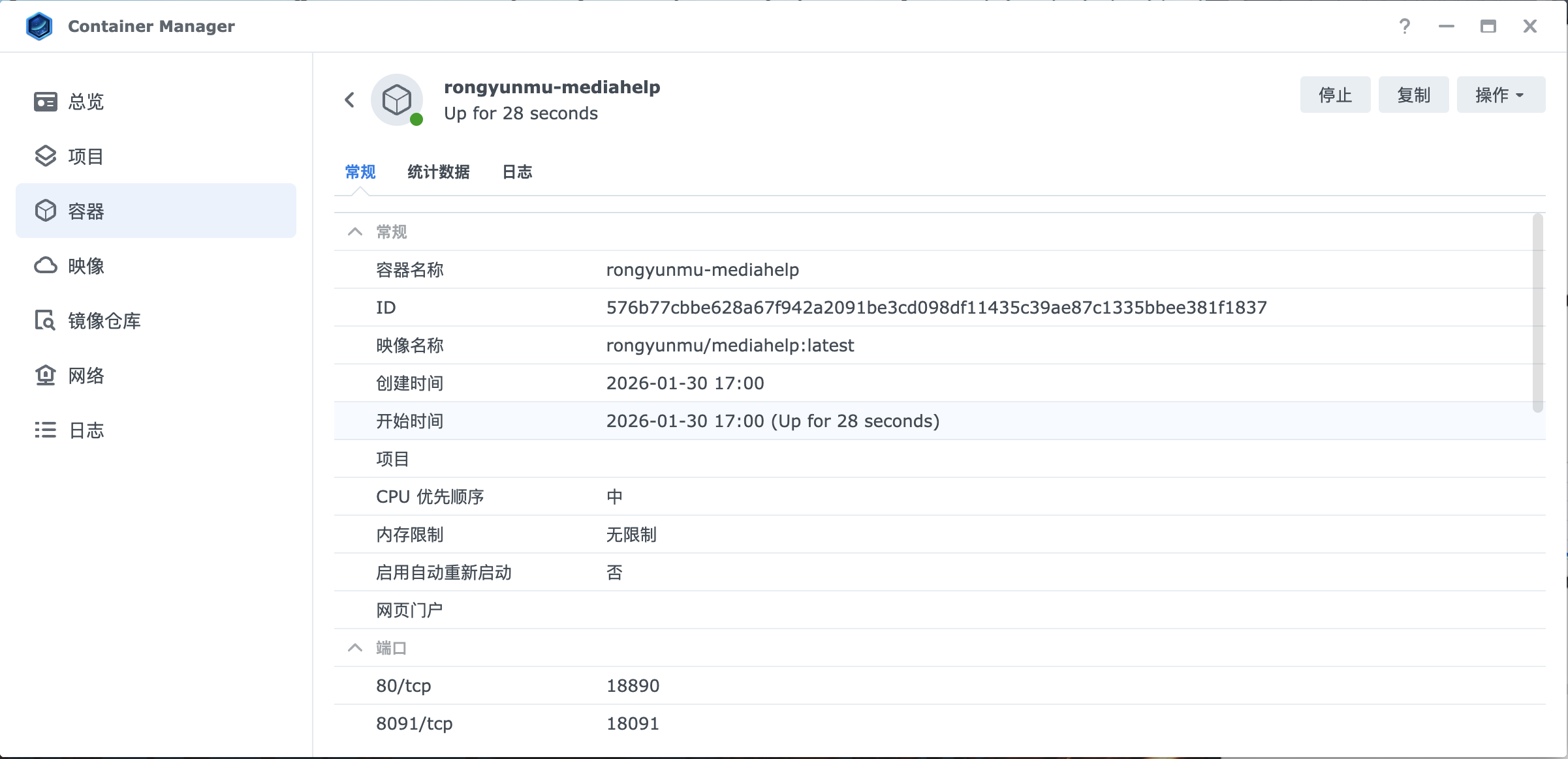 点击 “下一步” ,确认设置无误后,点击 “完成” ,即可启动 mediahelp 容器。启动后,可以在 “容器” 页面看到正在运行的 mediahelp 容器,其状态显示为 “正在运行” ,表示部署成功。
