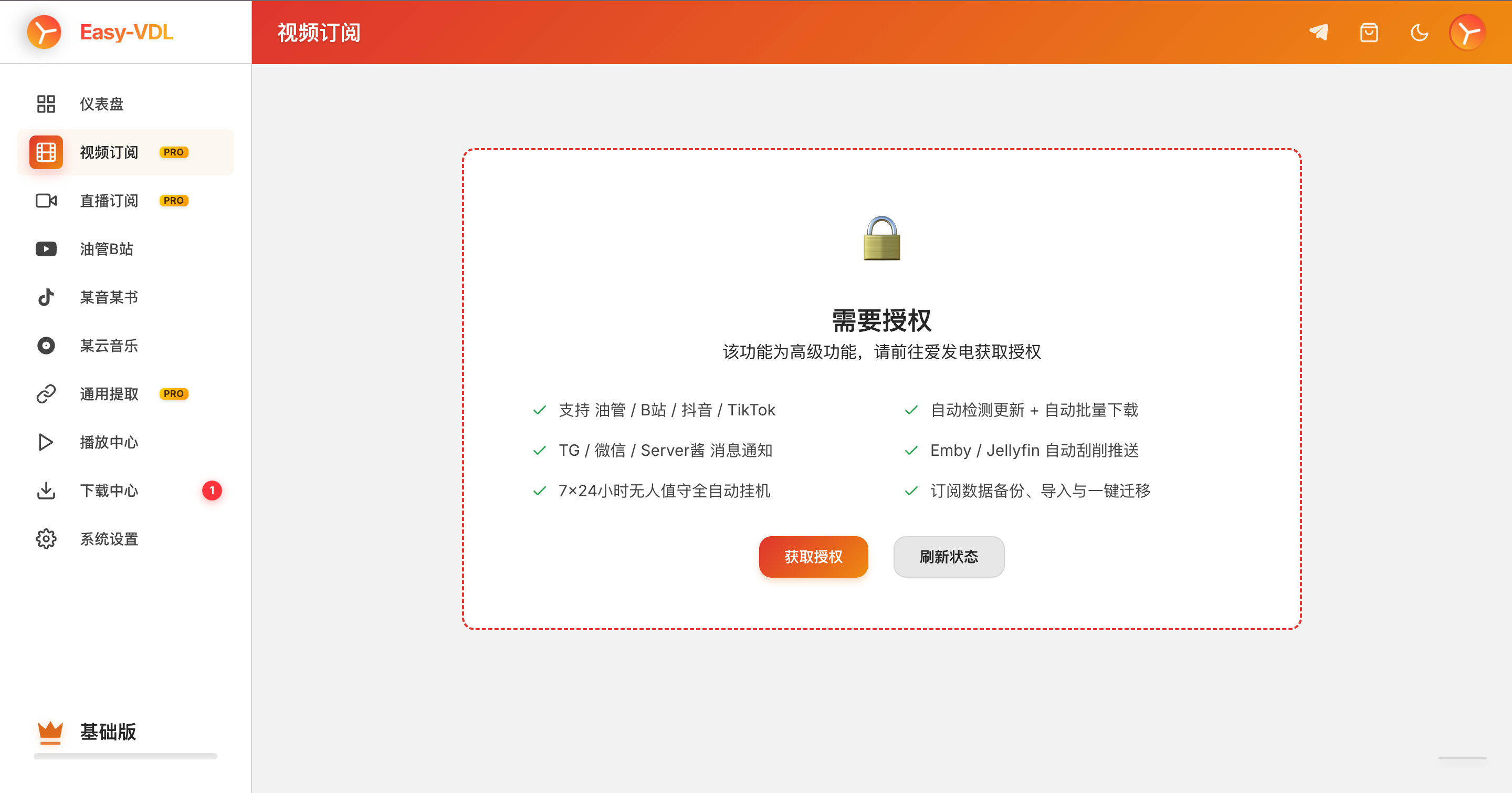 Easy-VDL 是一款支持多平台的视频解析下载、视频订阅、直播订阅的可视化平台。内置博主订阅系统、直播订阅系统、批量下载、Emby/Jellyfin 元数据自动生成、核显硬件加速转码播放,界面美观,操作简单。