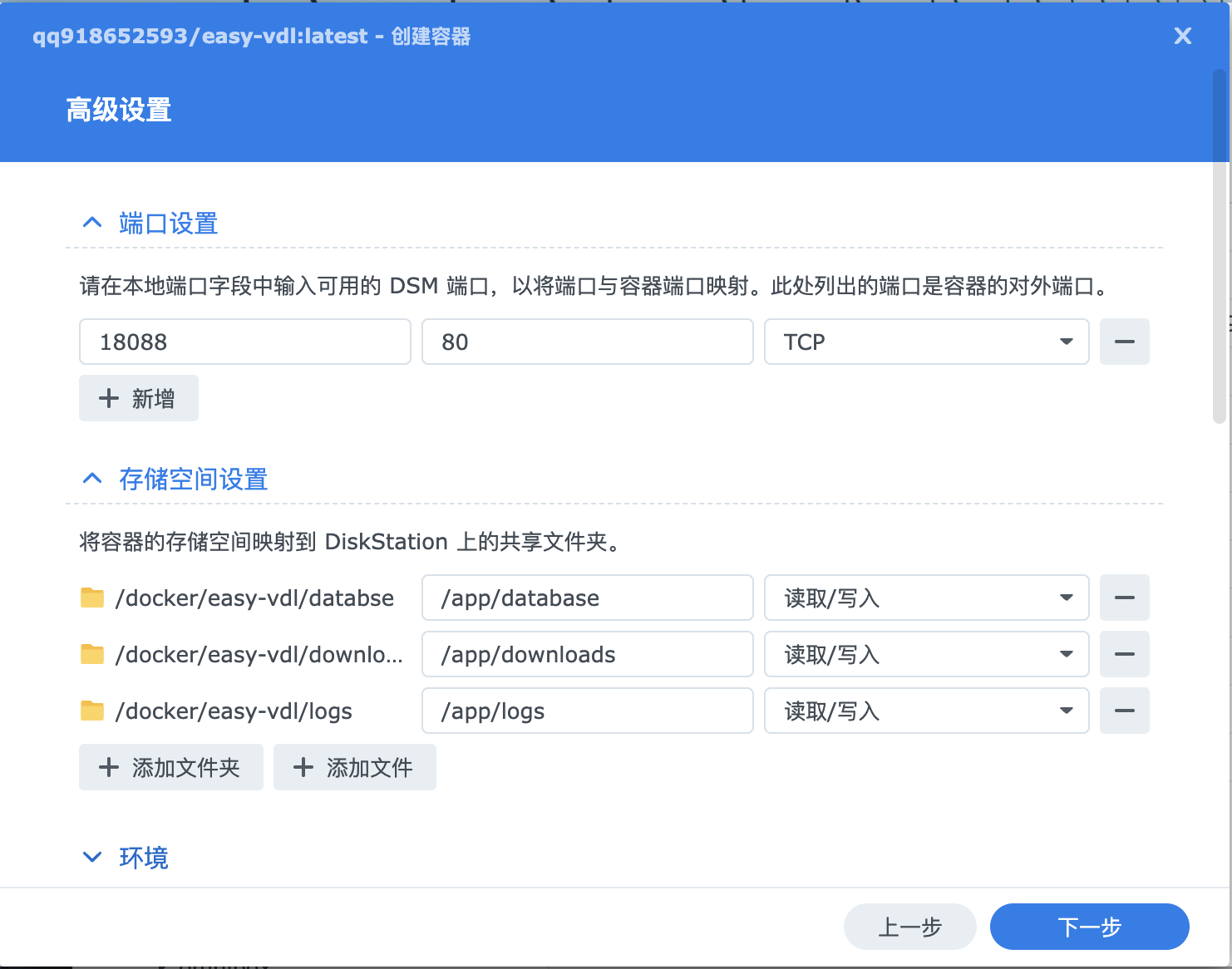 /volume1/docker/easy-vdl/config、/volume1/docker/easy-vdl/downloads、/volume1/docker/easy-vdl/logs