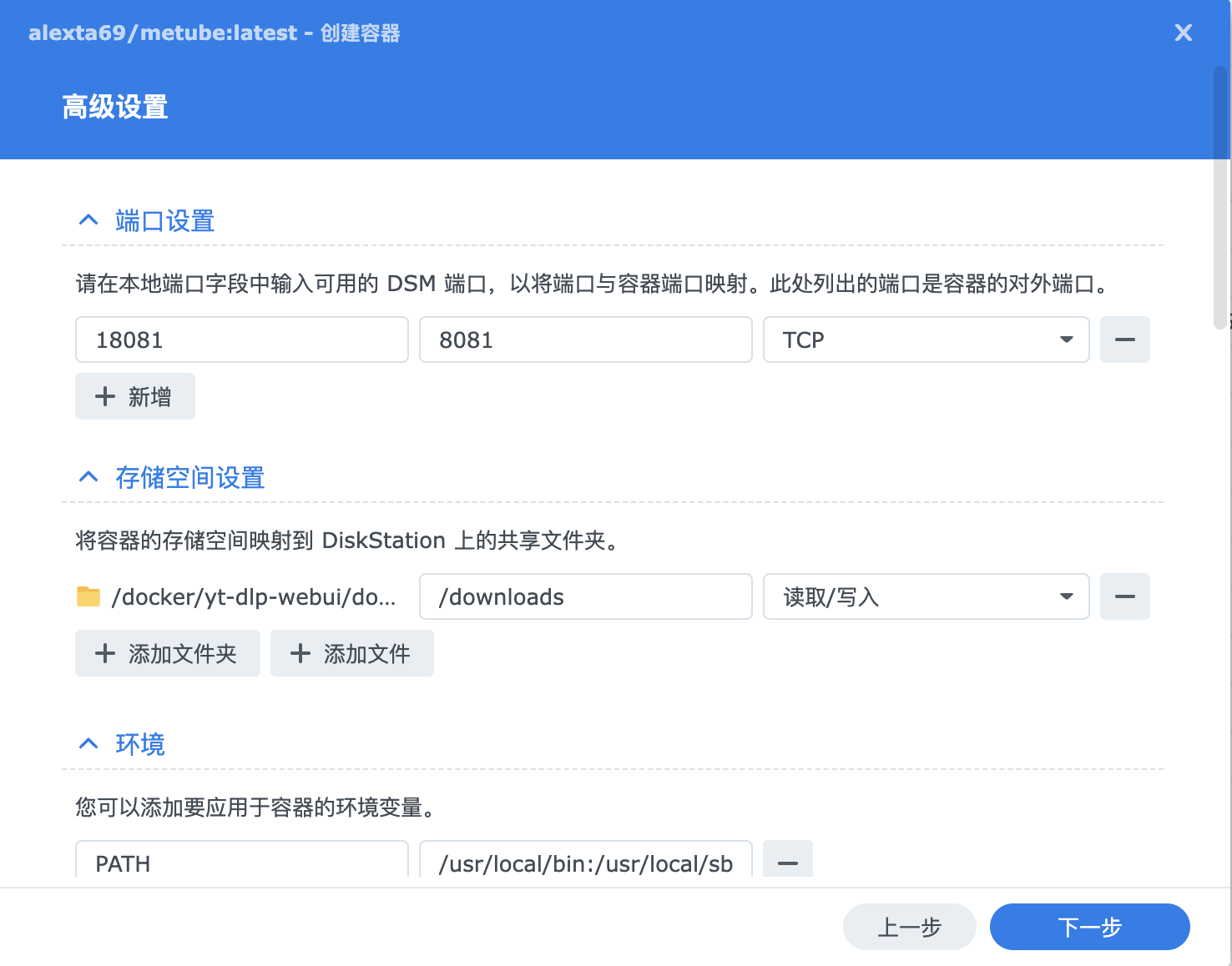 2. 在 “基本设置” 中,为容器自定义一个名称,例如 “metube” ,方便识别和管理。