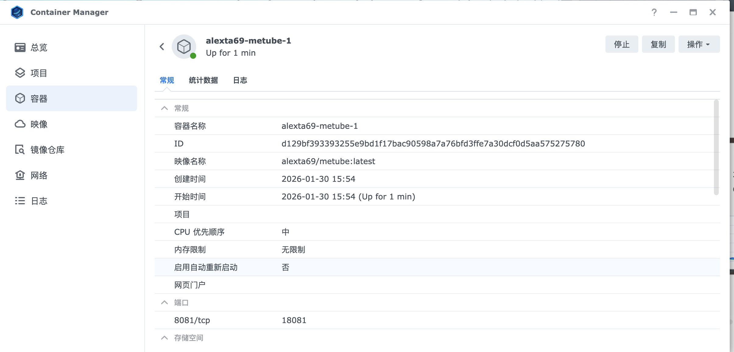 点击 “下一步” ,确认设置无误后,点击 “完成” ,即可启动 MeTuBe 容器。启动后,可以在 “容器” 页面看到正在运行的 MeTuBe 容器,其状态显示为 “正在运行” ,表示部署成功。