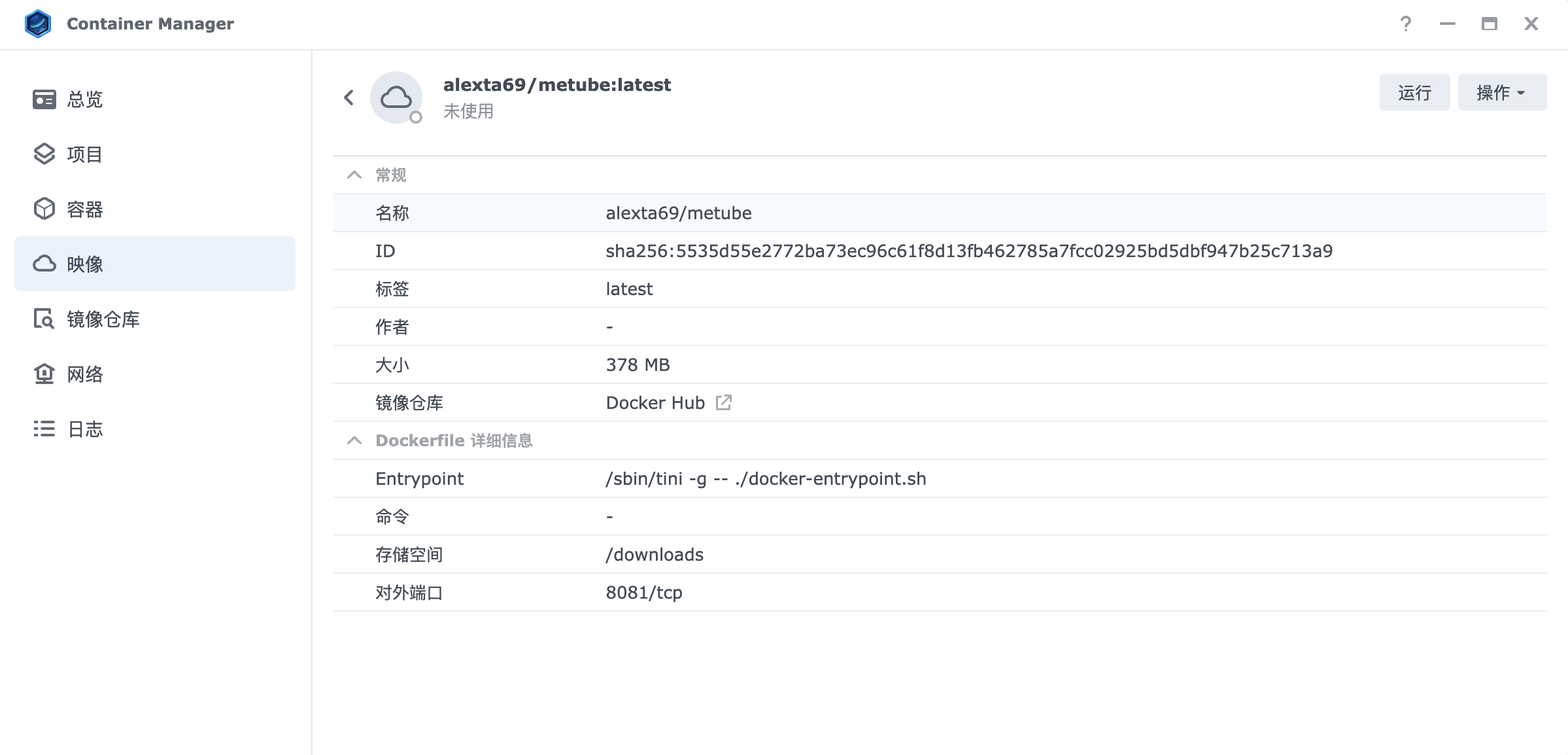 在Container Manager映像搜索框中输入 “alexta69/metube”点击搜索,在搜索结果中找到 “alexta69/metube” 镜像,点击 “下载” 按钮。