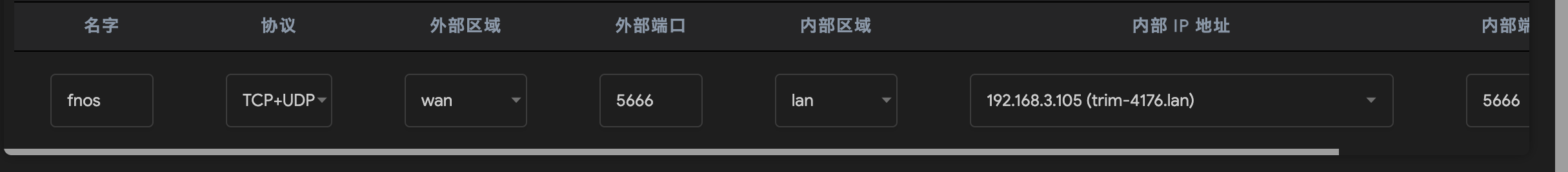 比如飞牛Nas默认端口是5666,需要在防火墙中设置一条端口转发,内部IP就选飞牛Nas的ip,设置完成以后就可以用ddns解析的域名加这里的外部端口访问飞牛Nas了。