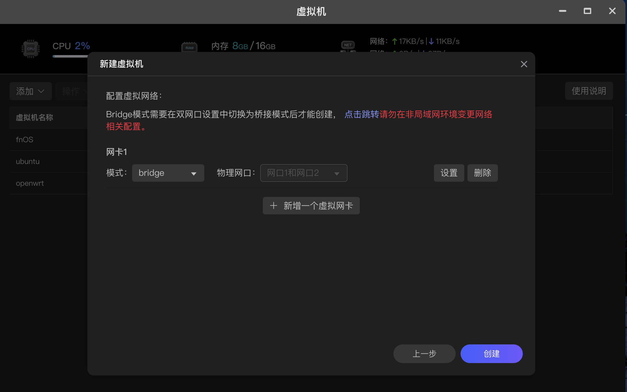 网络模式bridge,网口因为我的是聚合的,所以默认网口1和2在一起,根据实际情况选择网口即可,网卡选择e1000