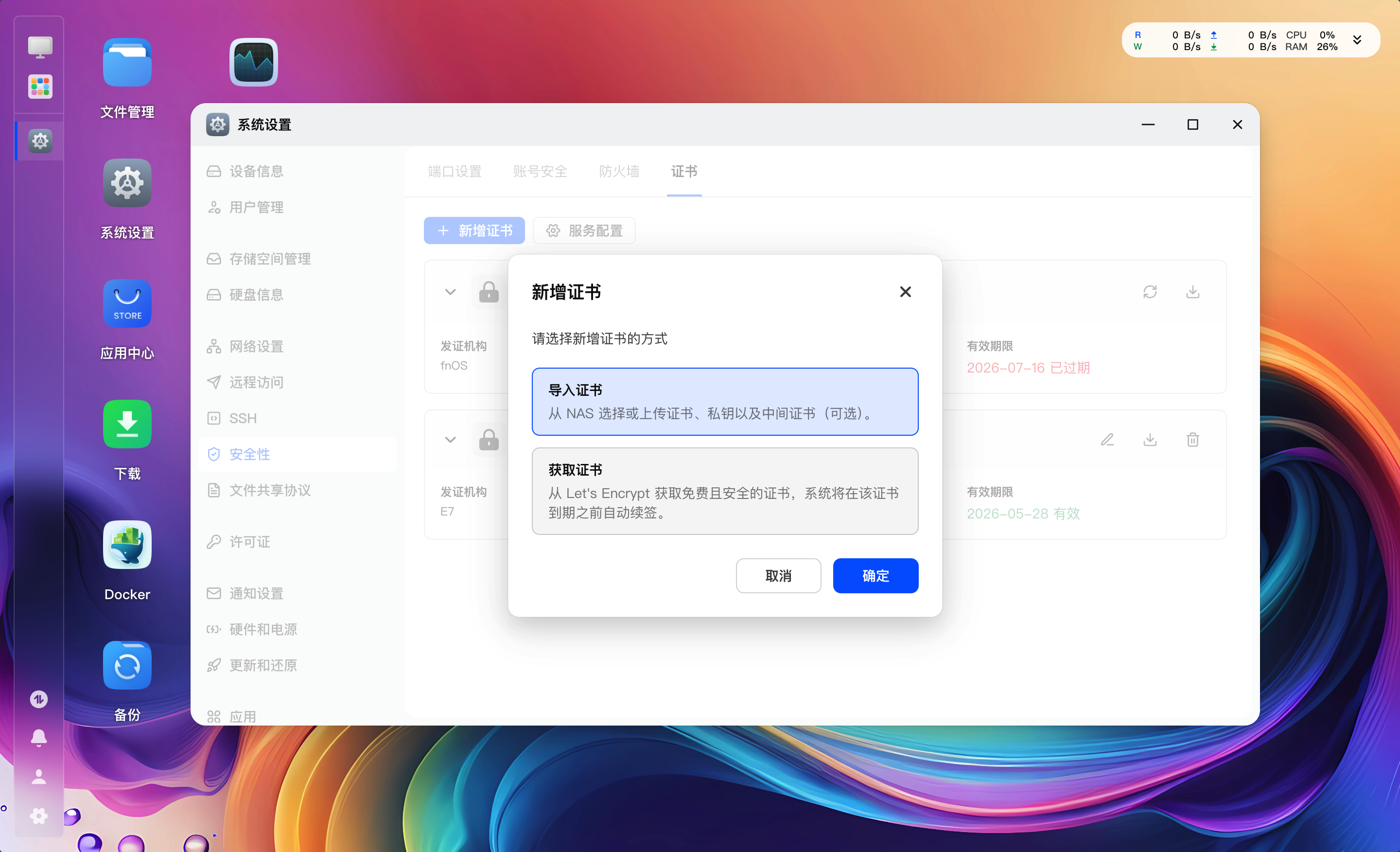 安全性-证书,可以导入也可以自行申请