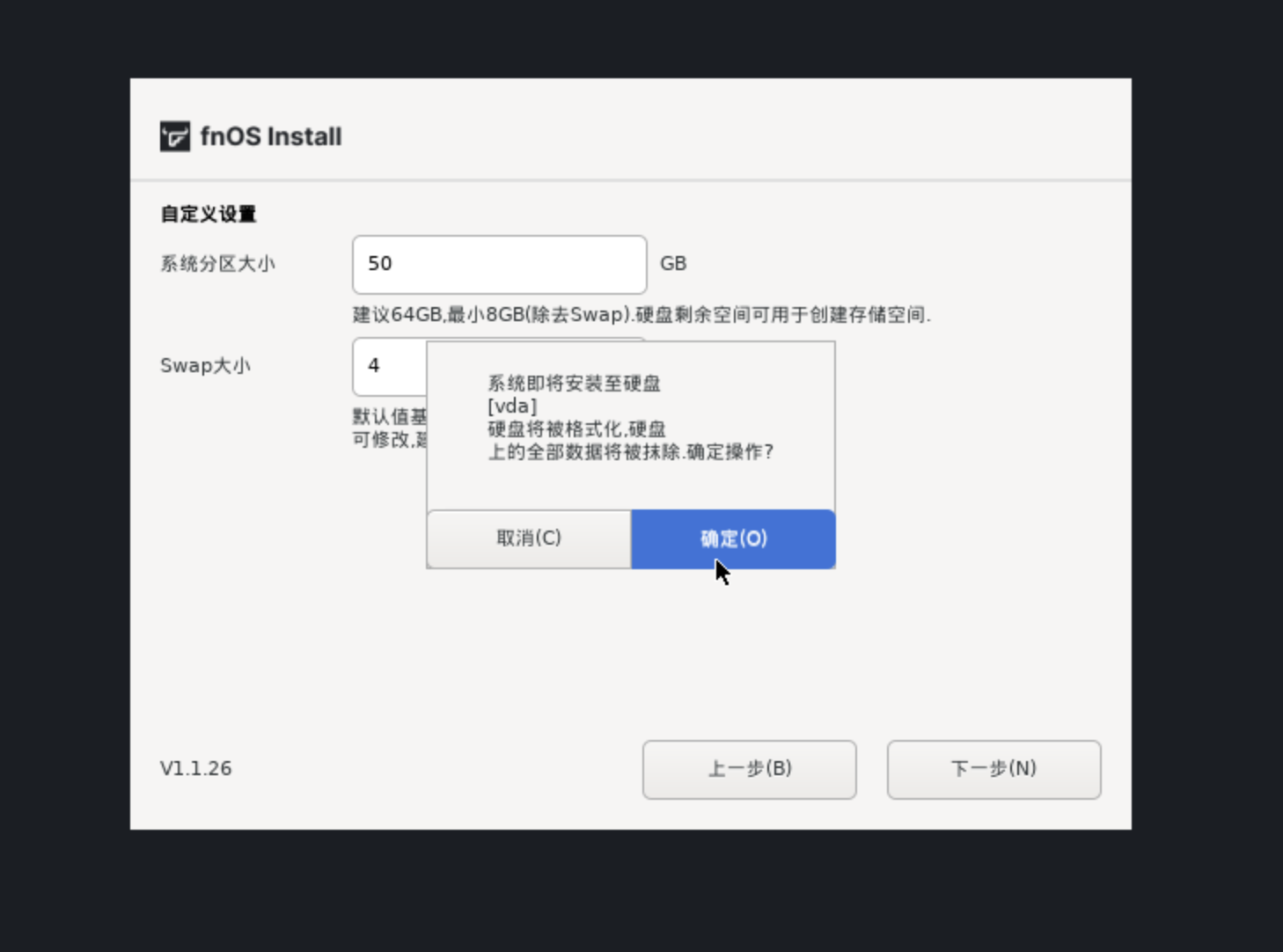 格式化硬盘,确定以后等待安装完成